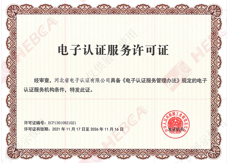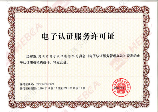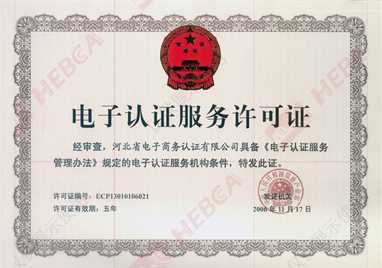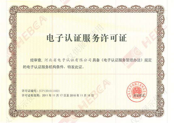 2011年11月17日河北省電子認(rèn)證有限公司取得國家工業(yè)和信息化部換發(fā)的《電子認(rèn)證服務(wù)許可證》。